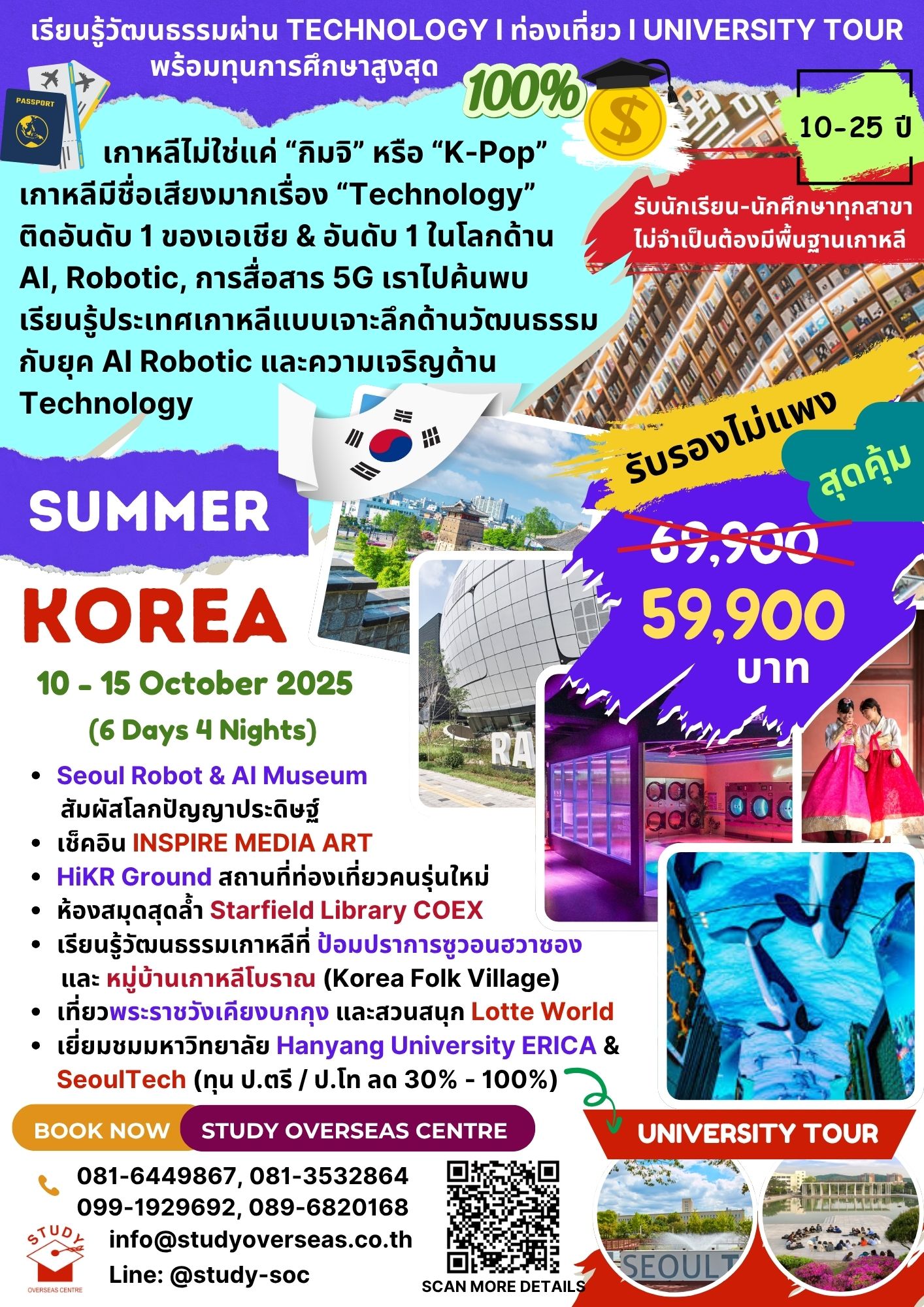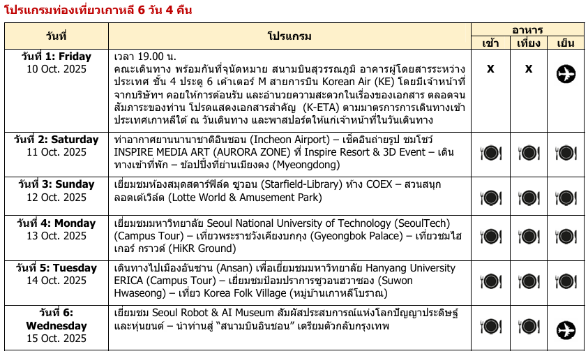 บินสบายๆกับ Korean Air – เช็คอินที่ INSPIRE MEDIA ART (AURORA ZONE) – เรียนรู้วัฒนธรรมเกาหลีผ่านกิจกรรมสนุกๆ พร้อมเยี่ยมชมมหาวิทยาลัยชื่อดัง 2 แห่ง – สัมผัสประสบการณ์แห่งโลกปัญญาประดิษฐ์และหุ่นยนต์ที่ Seoul Robot & AI Museum – ถ่ายรูปสุดชิคที่ไฮเกอร์ กราว (HiKR Ground) และ ห้องสมุด Starfield Library COEX – เที่ยวชมพระราชวังเคียงบกกุง และป้อมปราการซูวอนฮวาซอง (Suwon Hwaseong) – สนุกสนานไปกับสวนสนุก Lotte World – ช้อปปิ้งย่านดังสุดชิค ย่านเมียงดง