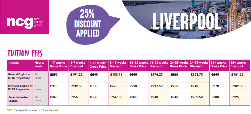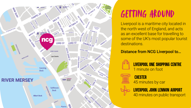 NCG Liverpool: เมืองลิเวอร์พูลเป็นเมืองที่เต็มไปด้วยประวัติศาสตร์และวัฒนธรรม และเป็นที่รู้จักไปทั่วโลกในฐานะที่ตั้งของถนนในเมืองที่พลุกพล่าน สโมสรฟุตบอลลิเวอร์พูลและเอเวอร์ตัน และวงดนตรีที่มีชื่อเสียงระดับโลกอย่าง The Beatles ทำให้ที่นี่เป็นสถานที่ที่น่าตื่นเต้นและไม่เหมือนใครสำหรับนักเรียนต่างชาติของเราที่จะมาสำรวจในระหว่างการศึกษา