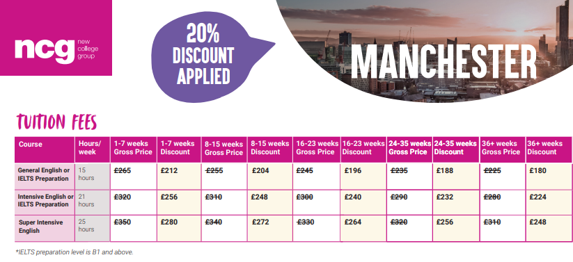 NCG Manchester: เมืองแมนเชสเตอร์เป็นเมืองที่คึกคักและมีชีวิตชีวา ซึ่งเป็นที่ตั้งของโรงเรียนแห่งแรกของเรา และยังเป็นศูนย์กลางทางวัฒนธรรมที่สำคัญของภาคเหนือของอังกฤษอีกด้วย เมืองแมนเชสเตอร์มีชื่อเสียงในด้านสถาปัตยกรรมที่สวยงาม ชีวิตกลางคืนที่คึกคัก และประวัติศาสตร์การกีฬา จึงเป็นสถานที่ที่ยอดเยี่ยมสำหรับทั้งการทำงานและการพักผ่อน
