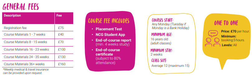 New College Group (NCG) เป็นวิทยาลัยเฉพาะทางที่สอนภาษาอังกฤษ โดยมีโรงเรียนตั้งอยู่ในเมืองที่ดีที่สุดบางแห่งในสหราชอาณาจักรสำหรับนักเรียน พบปะกับนักเรียนจากทั่วโลกและเรียนภาษาอังกฤษไปพร้อมกับความสนุกสนานและทำความรู้จักกับโรงเรียนสอนภาษาอังกฤษของ New College Group ทีมงานที่เป็นมิตรและคอยช่วยเหลือคุณเสมอเพื่อช่วยเหลือคุณในทุกสิ่งที่คุณต้องการ และทำให้แน่ใจว่าคุณจะมีเส้นทางการเป็นนักเรียนที่ประสบความสำเร็จ สร้างความทรงจำอันน่าประทับใจที่คงอยู่ตลอดไป