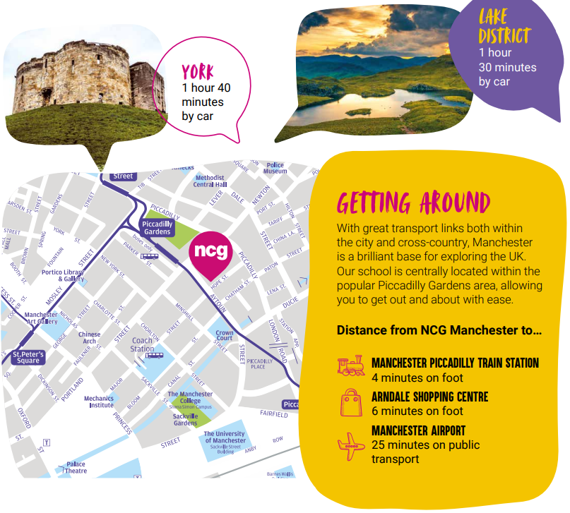 ด้วยการเชื่อมโยงการขนส่งที่ดีเยี่ยมทั้งภายในเมืองและต่างจังหวัด แมนเชสเตอร์จึงเป็นฐานที่ยอดเยี่ยมสำหรับการเที่ยวชมสหราชอาณาจักร โรงเรียนของเรามีทำเลอยู่ใจกลางย่าน Piccadilly Gardens ที่เป็นที่นิยม ช่วยให้คุณเดินทางออกไปไหนมาไหนได้อย่างสะดวก ด้วยทำเลที่ตั้งที่ยอดเยี่ยมและสิ่งอำนวยความสะดวกที่ทันสมัย NCG Manchester จึงเป็นตัวเลือกที่ยอดเยี่ยมสำหรับการศึกษาของคุณ