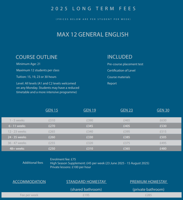 General English: เรียน 15 - 30 hours / week รับอายุ 21 ปีขึ้นไป