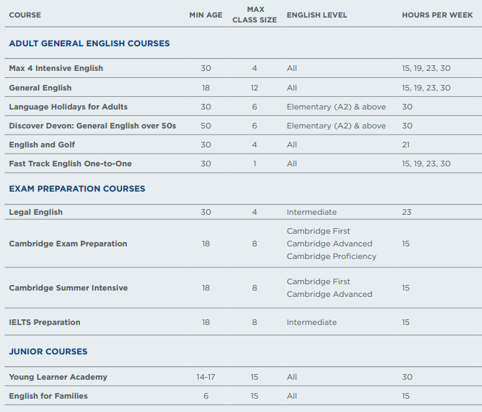เราเปิดสอนหลักสูตรภาษาอังกฤษทั่วไปที่มีความยืดหยุ่น โดยสามารถเลือกชั่วโมงเรียนได้ต่อสัปดาห์ หลักสูตรสำหรับผู้ที่มีอายุมากกว่า 30 ปีและมากกว่า 50 ปี และหลักสูตรภาษาอังกฤษสำหรับธุรกิจและวิชาชีพให้เลือก หลักสูตรสำหรับครอบครัวของเราเปิดสอนตลอดทั้งปี และอนุญาตให้ผู้ปกครองที่มีบุตรอายุระหว่าง 6 ถึง 15 ปี เรียนกับเราได้อย่างสบายใจว่าบุตรหลานของตนได้รับการสอนและดูแลในเวลาเดียวกันกับที่เรียนอยู่ หลักสูตรนี้สามารถจัดได้เฉพาะในช่วงเช้าเท่านั้น เพื่อให้ผู้ปกครองสามารถรับบุตรหลานของตนและใช้เวลาช่วงบ่ายร่วมกันได้ หากผู้ปกครองต้องการเข้าเรียนในช่วงบ่ายหรือมีแผนอื่น เราสามารถจัดแพ็คเกจกิจกรรมสำหรับเด็กๆ ในช่วงบ่ายได้ Young Learners Academy ของเราเปิดรับนักเรียนอายุ 14 ถึง 17 ปี เรามุ่งเน้นอย่างยิ่งว่านักเรียนจะได้รับการดูแลอย่างดีในสภาพแวดล้อมที่ปลอดภัย
