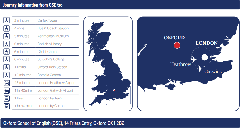 OSE (Oxford School of English) ตั้งอยู่ในใจกลางเมืองมหาวิทยาลัยอ็อกซ์ฟอร์ด โดยเปิดสอนหลักสูตรภาษาอังกฤษคุณภาพสูงและการสอบที่เกี่ยวข้อง OSE ได้รับการรับรองจาก British Council สำหรับการสอนภาษาอังกฤษ