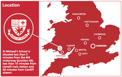 | St. Michael's School: เป็นโรงเรียนสหศึกษาเปิดรับนักเรียนประจำและไป-กลับ ก่อตั้งขึ้นเมื่อปี ค.ศ. 1923 จากโรงเรียนมองเห็นแหลมโกเวอร์ซึ่งมีเส้นทางเดินเลียบชายฝั่งและชสยหาดที่สวยงาม โรงเรียนตั้งอยู่ในเมือง Bryn ที่สงบและปลอดภัย สามารถนั่ง Taxi เข้าเมือง Llanelli ได้ ห่างจาก Swansea 15 นาที และห่างจาก Cardiff 1 ชั่วโมงโดยรถไฟ | |