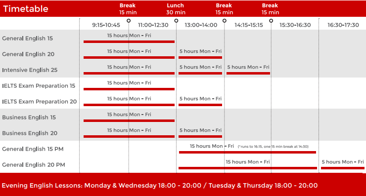 โรงเรียนภาษาอังกฤษที่ได้รับการรับรองของเราสอนภาษาอังกฤษเชิงปฏิบัติที่คุณสามารถใช้ทุกวัน การสนทนาและการพูดเป็นจุดเน้นหลักพร้อมการฝึกฝนไวยากรณ์และการเขียนมากมาย ที่สำคัญ คุณสามารถเลือกจำนวนชั่วโมงที่เหมาะกับคุณจากหลักสูตรภาษาอังกฤษในลอนดอนของเรา หลักสูตรมีระยะเวลา 15, 20 และ 25 ชั่วโมงต่อสัปดาห์ เมื่อคุณเรียนกับเรา คุณจะได้เรียนรู้ภาษาที่ช่วยให้คุณก้าวหน้าในด้านการศึกษาและอาชีพการงาน