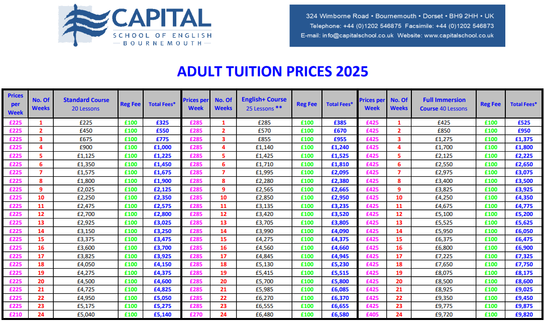 Capital School of English เป็นโรงเรียนสอนภาษาอิสระที่บริหารงานโดยครอบครัว โรงเรียนของเราตั้งอยู่บนชายฝั่งทางใต้ของอังกฤษในเมืองริมทะเลที่ชื่อว่าบอร์นมัธ (Bournemouth) นักเรียนได้เรียนภาษาอังกฤษที่ Capital School of English ตั้งแต่ปี 2003 และเรียนผ่านหลักสูตรออนไลน์สดตั้งแต่ปี 2013 พันธกิจของเราคือการช่วยเหลือและสนับสนุนนักเรียนทุกคนในเส้นทางการเรียนรู้ส่วนบุคคล เพื่อพัฒนาทักษะและความมั่นใจในภาษาอังกฤษ และบรรลุศักยภาพด้านภาษาอังกฤษของแต่ละบุคคล