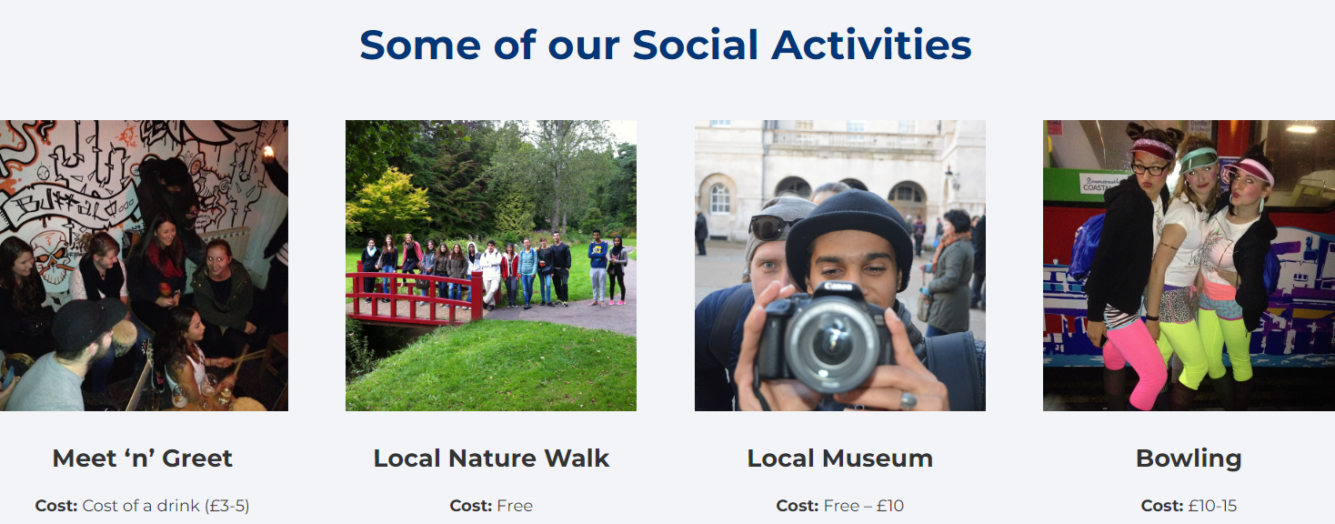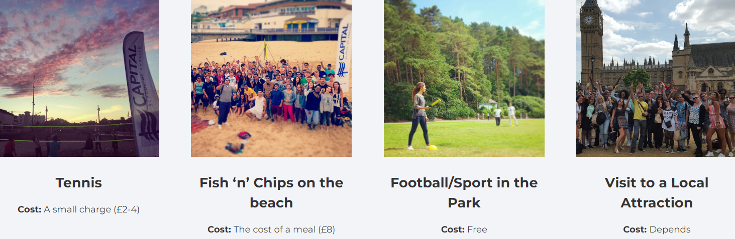 Capital School of English นำเสนอโปรแกรมกิจกรรมทางสังคมของโรงเรียน โดยมีกิจกรรมมากถึง 3 กิจกรรมต่อสัปดาห์ (ตั้งแต่เดือนกันยายนถึงเดือนมิถุนายน) และกิจกรรม 3 กิจกรรมพร้อมทัศนศึกษาเต็มวันต่อสัปดาห์ (เดือนกรกฎาคมและสิงหาคม) โปรแกรมกิจกรรมทางสังคมของเราเป็นวิธีที่ยอดเยี่ยมในการฝึกภาษาอังกฤษนอกห้องเรียนและพบปะนักเรียนจากชั้นเรียนอื่นๆ เรามีกิจกรรมหลากหลาย บางกิจกรรมฟรีและบางกิจกรรมมีค่าใช้จ่ายเล็กน้อย