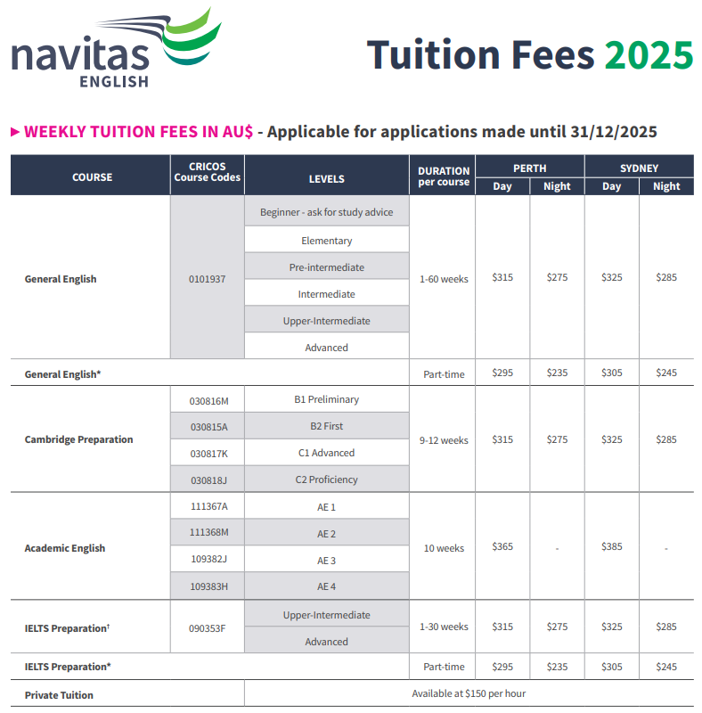 โรงเรียนตั้งอยู่ในย่านชานเมืองนอร์ธบริดจ์ที่มีชีวิตชีวาและมีความหลากหลายทางวัฒนธรรม ห่างจากใจกลางเมืองไม่ถึง 1 กิโลเมตร ห่างจากสถานีรถไฟเพิร์ธเซ็นทรัลเพียง 5 นาทีเมื่อเดินเท้า และห่างจากสถานีขนส่งกลางประมาณ 7 นาทีเมื่อเดินเท้า นอร์ธบริดจ์รายล้อมไปด้วยสถานที่ท่องเที่ยวที่มีเอกลักษณ์เฉพาะตัว ร้านขายของชำขนาดเล็ก และร้านกาแฟ ซึ่งทั้งหมดอยู่ห่างจากใจกลางเมืองไม่ไกล เพิร์ธเปิดสอนหลักสูตรภาษาอังกฤษของ Navitas ทุกหลักสูตร โดยมีตารางเวลาที่ยืดหยุ่น มีชั้นเรียนทั้งกลางวันและกลางคืน เรามีหลักสูตรภาษาอังกฤษที่เหมาะกับตารางเรียนที่ยุ่งที่สุดอย่างแน่นอน!