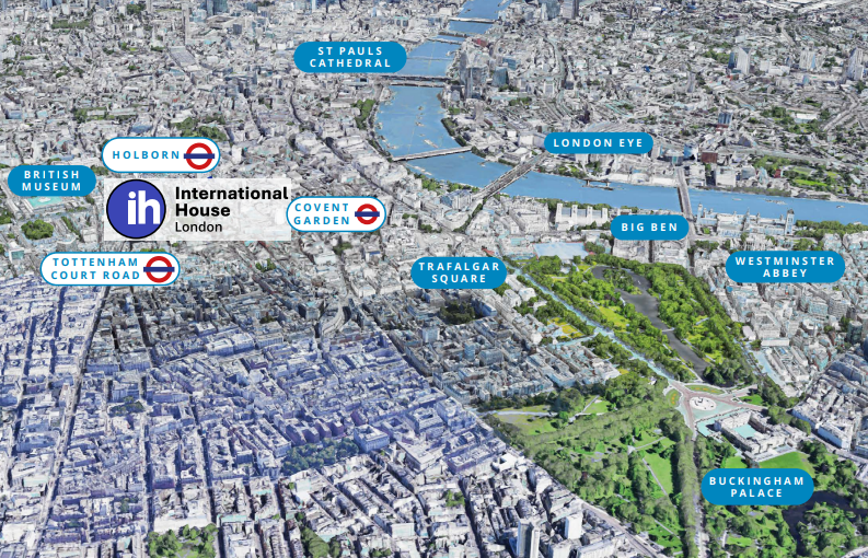 International House London ตั้งอยู่ในทำเลที่ดีเยี่ยมใจกลางกรุงลอนดอน ในย่านโคเวนท์การ์เดน (Covent Garden) อันมีชีวิตชีวา คุณสามารถเดินทางไปยังสถานที่ต่างๆ ในลอนดอนได้อย่างง่ายดายจากโรงเรียนของเรา ที่ตั้งของเราช่วยให้นักเรียนสามารถเดินทางไปยังสถานที่ท่องเที่ยวทางวัฒนธรรมที่มีชื่อเสียงระดับโลก สถานที่สำคัญที่เป็นสัญลักษณ์ และเส้นทางคมนาคมที่ยอดเยี่ยมได้อย่างง่ายดาย โดยสามารถเดินไปยังสถานีรถไฟใต้ดินหลายสถานีได้ สถานีที่ใกล้ที่สุดคือสถานีโคเวนท์การ์เดน (Covent Garden Station) (สายพิคคาดิลลี - Piccadilly Line) และสถานีโฮลบอร์น (Holborn Station) (สายเซ็นทรัล - Central Line และสายพิคคาดิลลี - Piccadilly Line)
