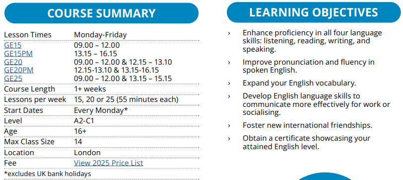 ![]() - General English - English Experience 30+ - One-to-ne English Lessons - Evening English Lessons - Family Winter Program |