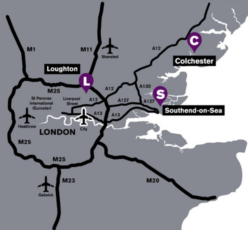 Southend-on-Sea: อยู่ห่างจาก Central London ประมาณ 45 นาที - 1 ชั่วโมงโดยรถไฟ และ 1.20 ชั่วโมงโดยรถยนต์ ที่ Colchester campus จะอยู่ห่างจากสนามบิน Heathrow Airport ประมาณ 2 ชั่วโมงโดยรถไฟ และ 1.20 ชั่วโมงโดยรถยนต์