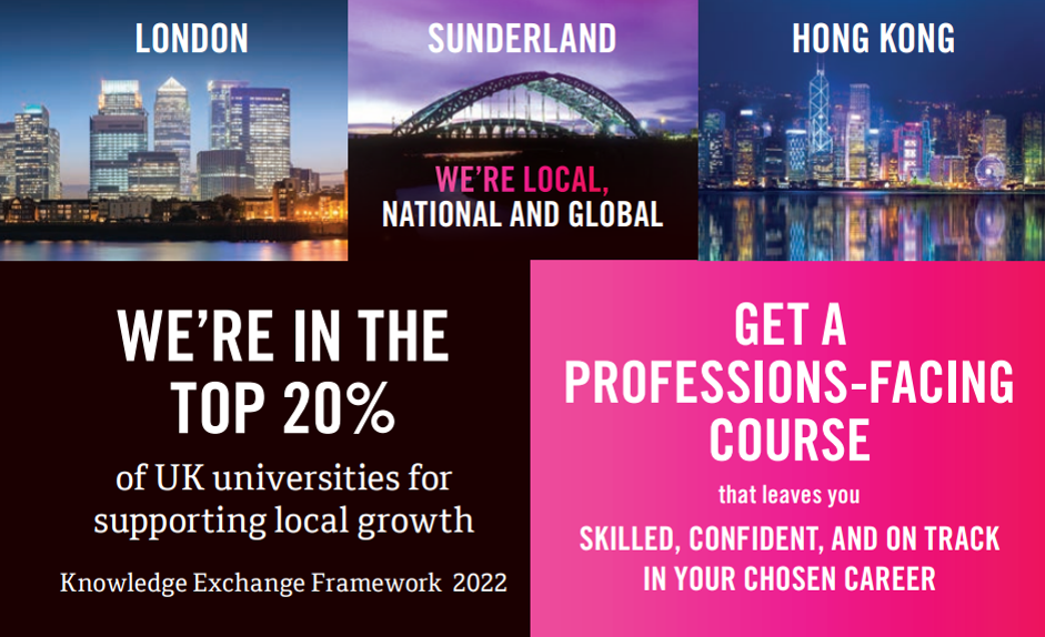 University of Sunderland: University of Sunderland (Sunderland Campus): เป็นมหาวิทยาลัยของรัฐบาล ก.พ. รับรอง มหาวิทยาลัยตั้งอยู่เมือง Sunderland ห่างจาก London ประมาณ 3 ชั่วโมง 30 นาทีโดยรถไฟ เมือง Sunderland มีประวัติศาสตร์อันยาวนานและเป็นหนึ่งในประเทศที่มีค่าครองชีพต่ำที่สุดในสหราชอาณาจักร City Campus เป็นศูนย์กลางของเมืองสมัยใหม่ และเป็นที่ตั้งของการบริหารและบริการ ห้องสมุด ห้องบรรยาย (Lecture Hall) และสิ่งอำนวยความสะดวกด้านกีฬาที่ยอดเยี่ยมที่ CitySpace เมืองเป็นศูนย์กลางของหลักสูตรศิลปะและการออกแบบของมหาวิทยาลัย และ Northern Center of Photography นอกจากนี้วิทยาเขตยังเป็นที่ตั้งของสถาบันวิทยาศาสตร์หลักของเรา ซึ่งเป็นที่ตั้งของโรงเรียนเภสัชศาสตร์ที่มีชื่อเสียงระดับโลก คณะพยาบาลศาสตร์และคณะแพทยศาสตร์ที่ได้ก่อตั้งขึ้นใหม่